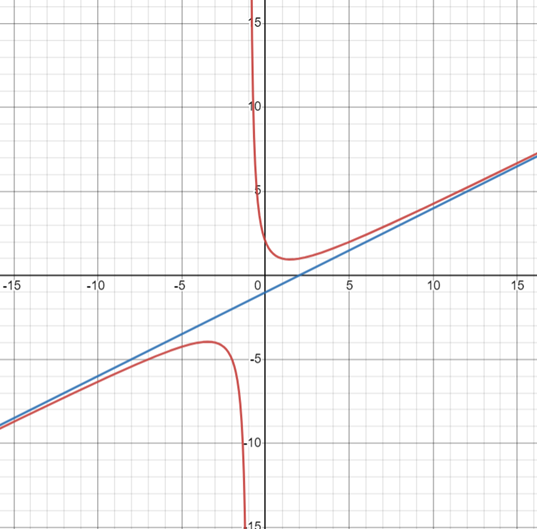 Obliczając granice z wymienionych wzorów, możemy wyznaczyć \(A\) oraz \(B\), dzięki którym wyznaczymy asymptotę ukośną \(y = Ax + B\).